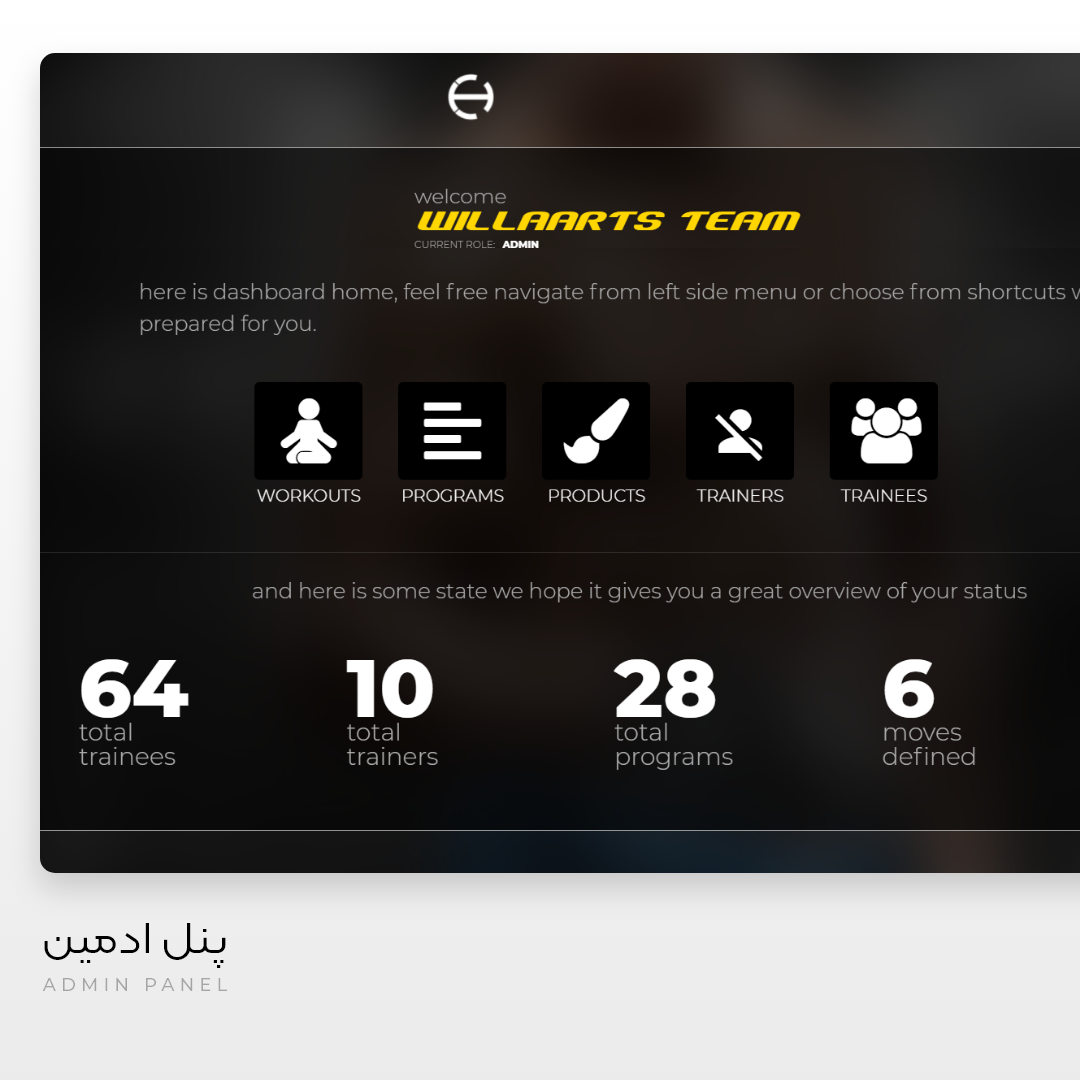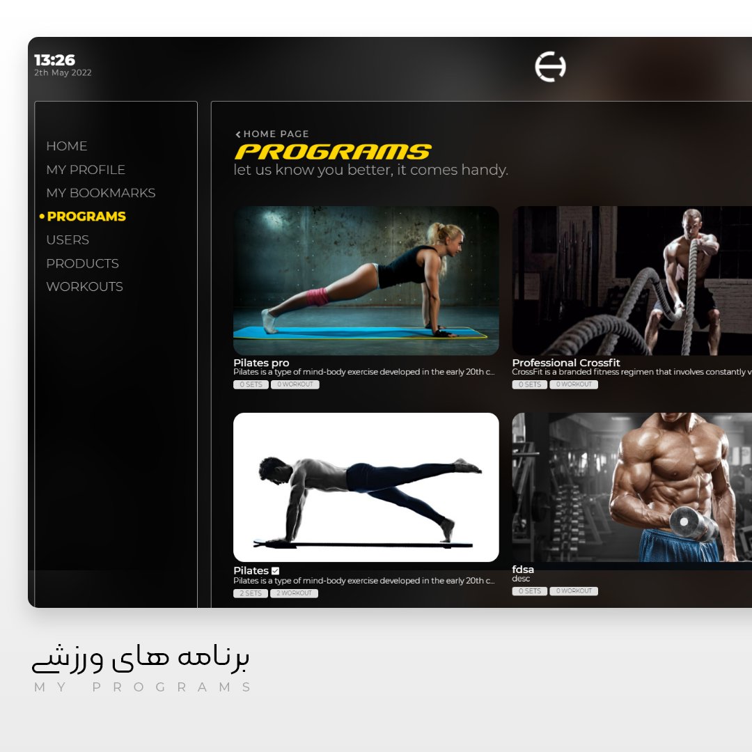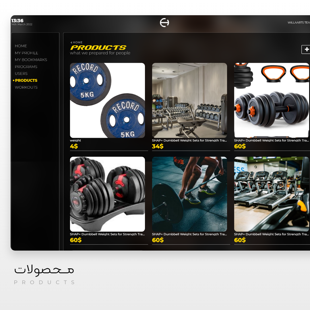 امکانات : محصولات، تصاویر و برنامه های ورزشی- Programs, Products طراحی مطابق با سایز تبلت و موبایل – Responsive ویرایش وبسایت توسط کاربر، بدون علم برنامه نویسی - UI Editor و سیستم مدیریت ارتباط با ورزشکاران فوق هوشمند – CRM مدیریت محصولات و تصاویر - Management System .