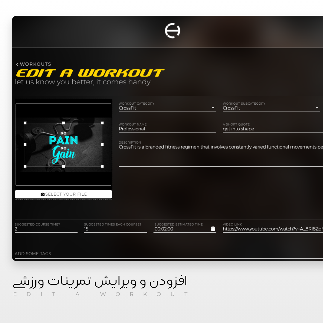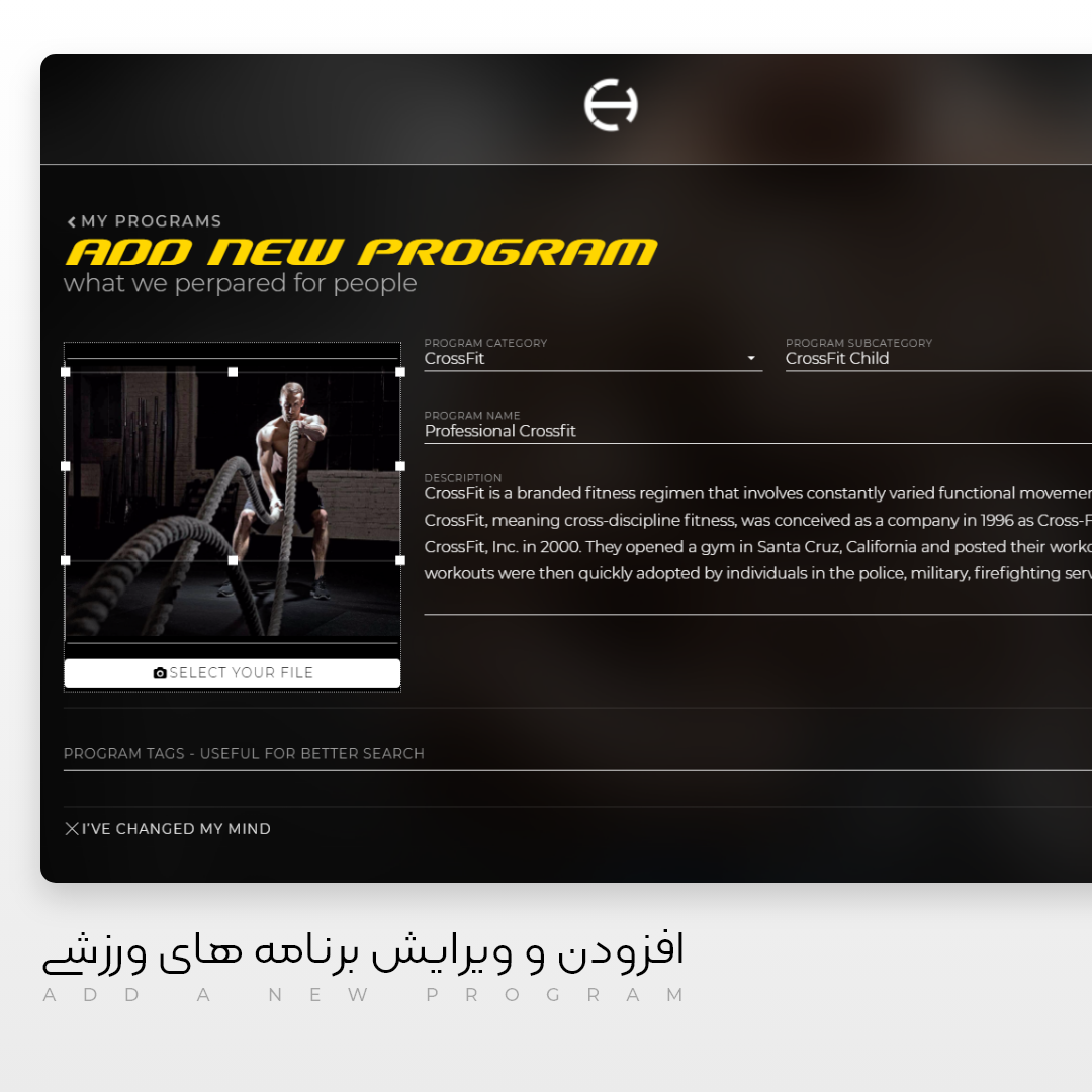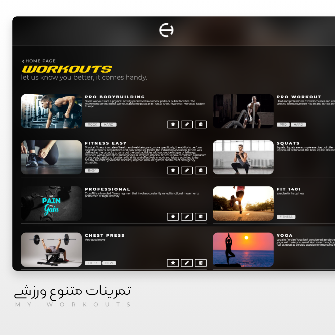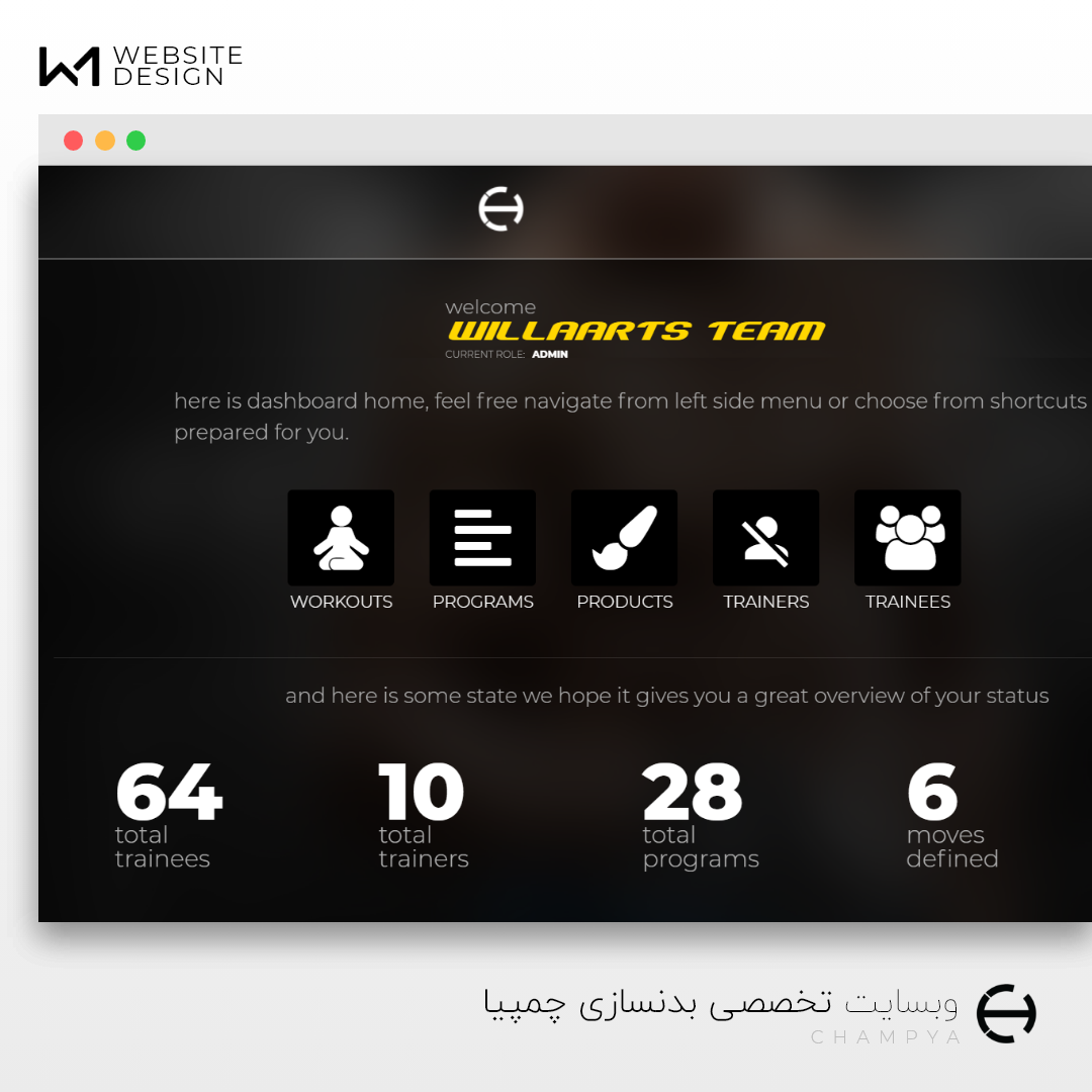 امکانات : محصولات، تصاویر و برنامه های ورزشی- Programs, Products طراحی مطابق با سایز تبلت و موبایل – Responsive ویرایش وبسایت توسط کاربر، بدون علم برنامه نویسی - UI Editor و سیستم مدیریت ارتباط با ورزشکاران فوق هوشمند – CRM مدیریت محصولات و تصاویر - Management System .