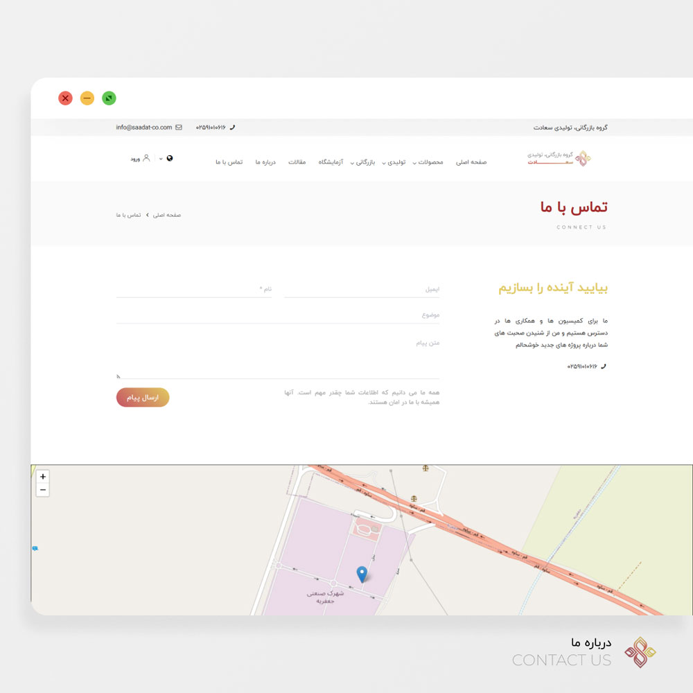 وبسایت طراحی شده برای هولدینگ سعادت قم : ناحیه صنعتی طغرود، بلوار غدیر کوچه نخل، پلاک NT52 . 025-36625967 ، 025-36625961